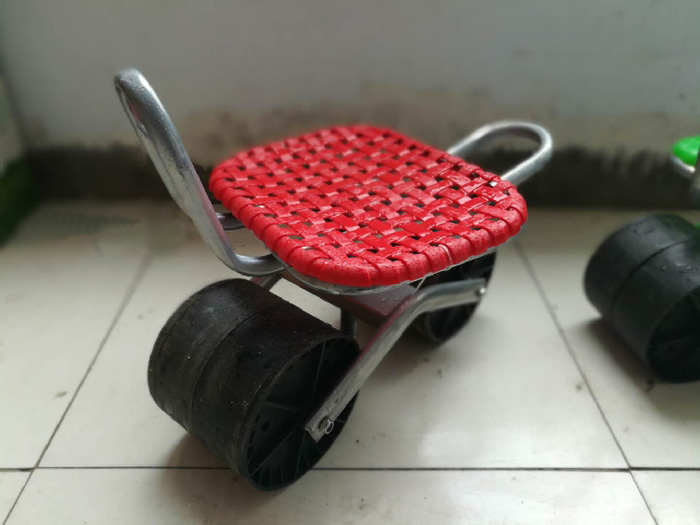 蔬菜大棚小凳子這種小凳子有兩輪,是個小車車,也叫田間小凳子,有加厚管壁的加厚輪子,干活的人坐在小凳子上,可以用屁股的力量往前挪到,四五個小時的工作量,也不會有多累。